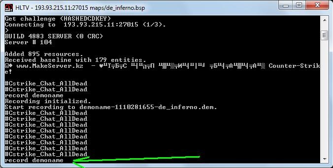 5. Теперь возвращаемся к нашему запущенному HLTV. Мы присоединили программу к нашему серверу, теперь надо начать записывать демку. Для этого пишем: record demoname (demoname - это название Вашей будущей демки, пишите что хотите, например, можно cw)