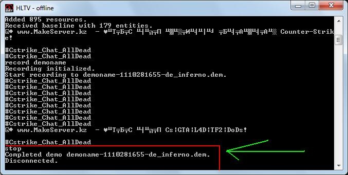 6. Когда то, что вы хотели отснять будет отснято, то просто пропишите stop, и HLTV остановит демку и сама отсоединится от сервера.